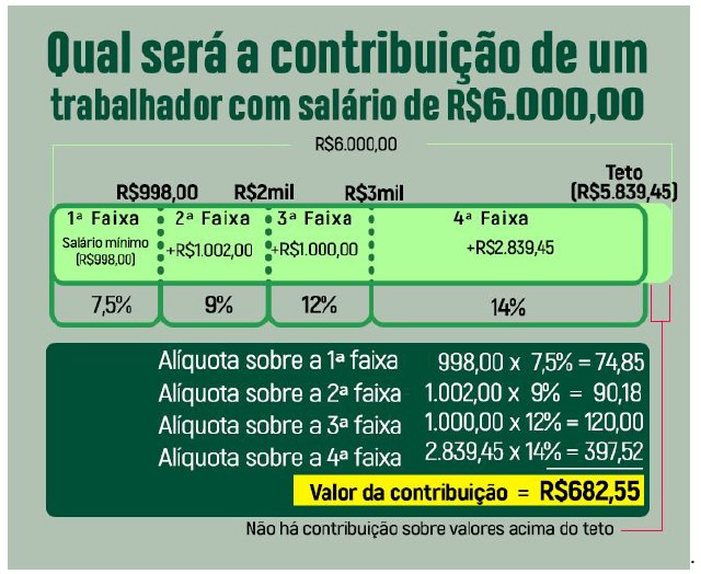 Importante ressaltar que as alíquotas passarão a incidir sobre cada faixa de remuneração, de forma semelhante ao cálculo do Imposto de Renda. Assim, por exemplo, um trabalhador que ganha exatamente o teto do RGPS (R$ 5.839,35) pagará uma alíquota efetiva total de 11,69%.