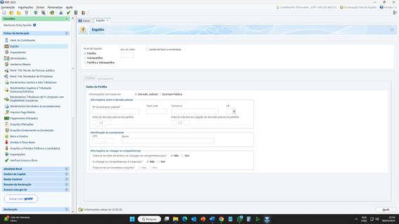 O contribuinte deverá utilizar o Programa Gerador da Declaração Final de Espólio do ano-calendário correspondente ao que for proferida a decisão judicial ou a lavratura da escritura pública, que estará disponível no sítio da Secretaria da Receita Federal do Brasil (RFB) na Internet no endereço < http://www.receita.fazenda.gov.br